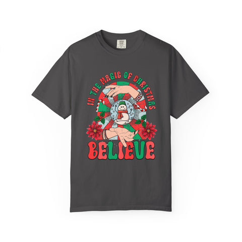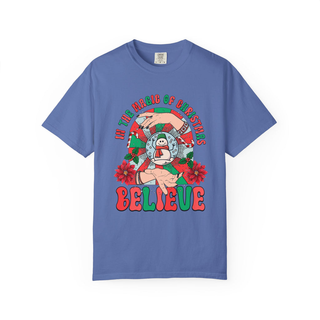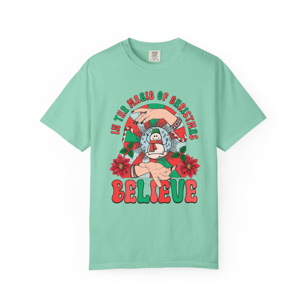 A soft, garment-dyed tee with a nostalgic holiday illustration that feels like a warm memory. The bright teal backdrop makes the vintage-inspired snowman, candy-cane wreath, poinsettias, and hand-lettered “BELIEVE” pop with cheerful contrast. Lightweight but substantial, the cotton knit wears in gently over time so the colors and texture become part of your everyday rotation. Wear it to low-key holiday hangouts, tree-lighting nights, or cozy afternoons decorating the house — it blends comfort with a playful, whimsical spirit that leans into seasonal traditions without shouting for attention.