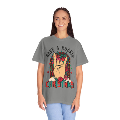This garment-dyed tee brings holiday spirit with a rebellious twist. The front shows a bold hand making the rock ’n’ roll horns framed by festive flowers and retro lettering that reads “Have a Rockin’ Christmas.” The medium-weight, 100% ring-spun cotton feels broken-in and soft thanks to the post-construction dye, while the relaxed cut and tubular knit give a comfortable, lived-in silhouette that layers easily under jackets or wears alone at parties. Colors are rich and slightly muted from the garment-dye process, so the vintage-inspired print pops without shouting. It’s the kind of shirt you reach for when you want to celebrate the season with attitude—singing along to carols, swapping vinyls by the tree, or crowding the living room for an impromptu gig.