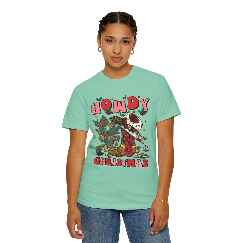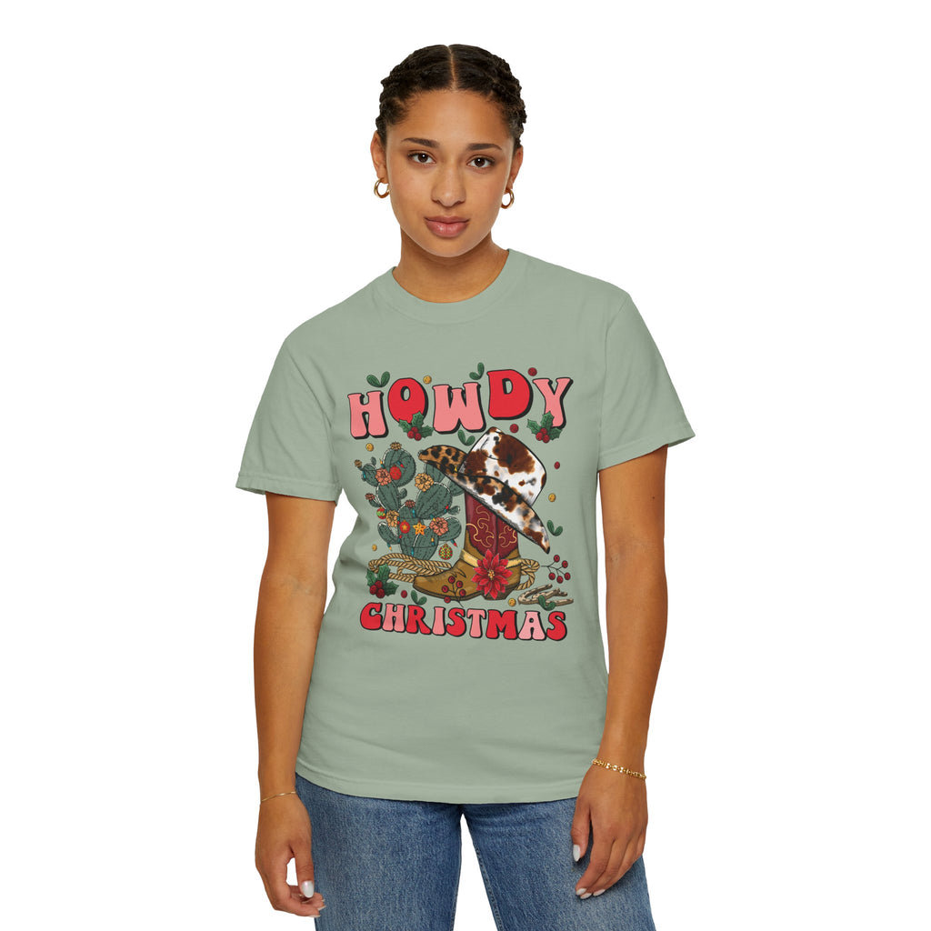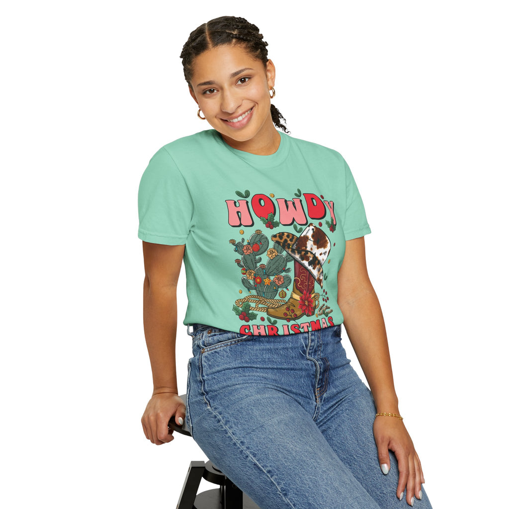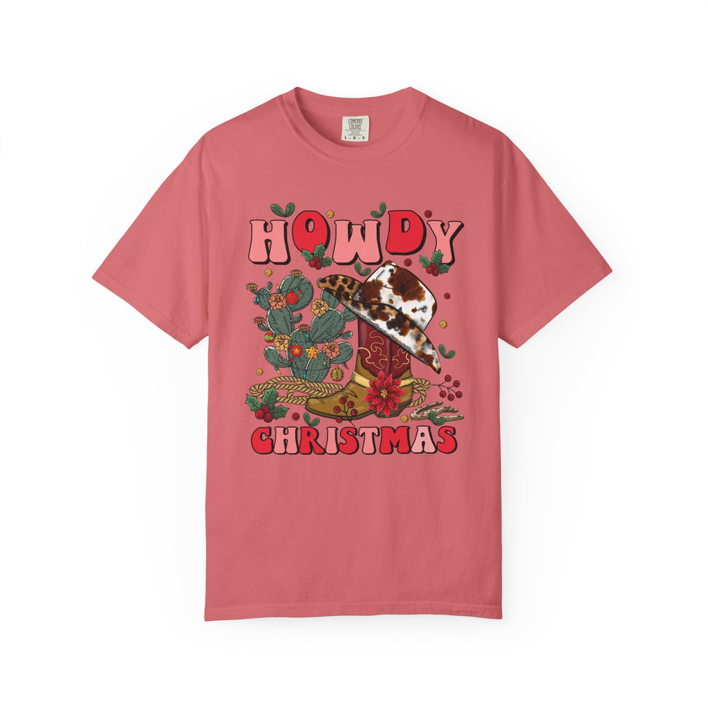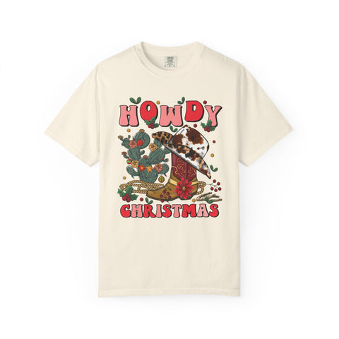A garment-dyed cotton tee with a warm, vintage-western holiday vibe. The relaxed-fit shirt features a distressed-style illustration of a cowboy hat, cactus and boots surrounded by festive greenery with bold, hand-lettered “Howdy Christmas” text. The soft, post-dyed finish gives the shirt a broken-in feel and muted, lived-in color that complements the retro artwork. Wear it on a chilly evening by the fire pit, layered under a flannel for a holiday hoedown, or around town when you want a little western charm with seasonal cheer.