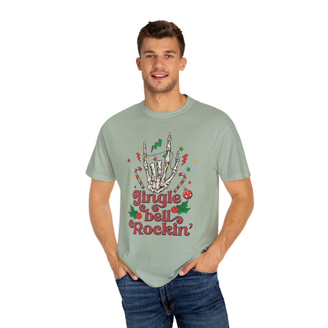 This relaxed, garment-dyed tee brings holiday mischief to your everyday wear. A hand-drawn skeletal hand gives a playful, rock-and-roll spin to classic Christmas motifs — candy canes, holly, and tiny stars swirl around the retro script that reads “Jingle bell Rockin’.” The soft, vintage-washed color and midweight cotton feel like an old favorite from the first wear. It sits loose over jeans or layered under a flannel for late-night caroling, rooftop parties, or cozy, music-filled gatherings. The look nods to punk-spirited holiday traditions while staying comfortable enough for long nights of laughter and playlists that never quit.