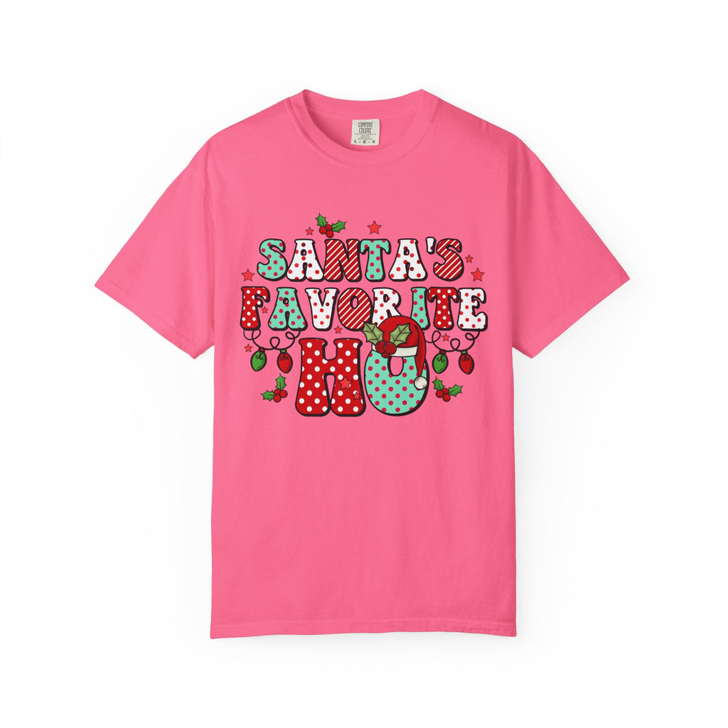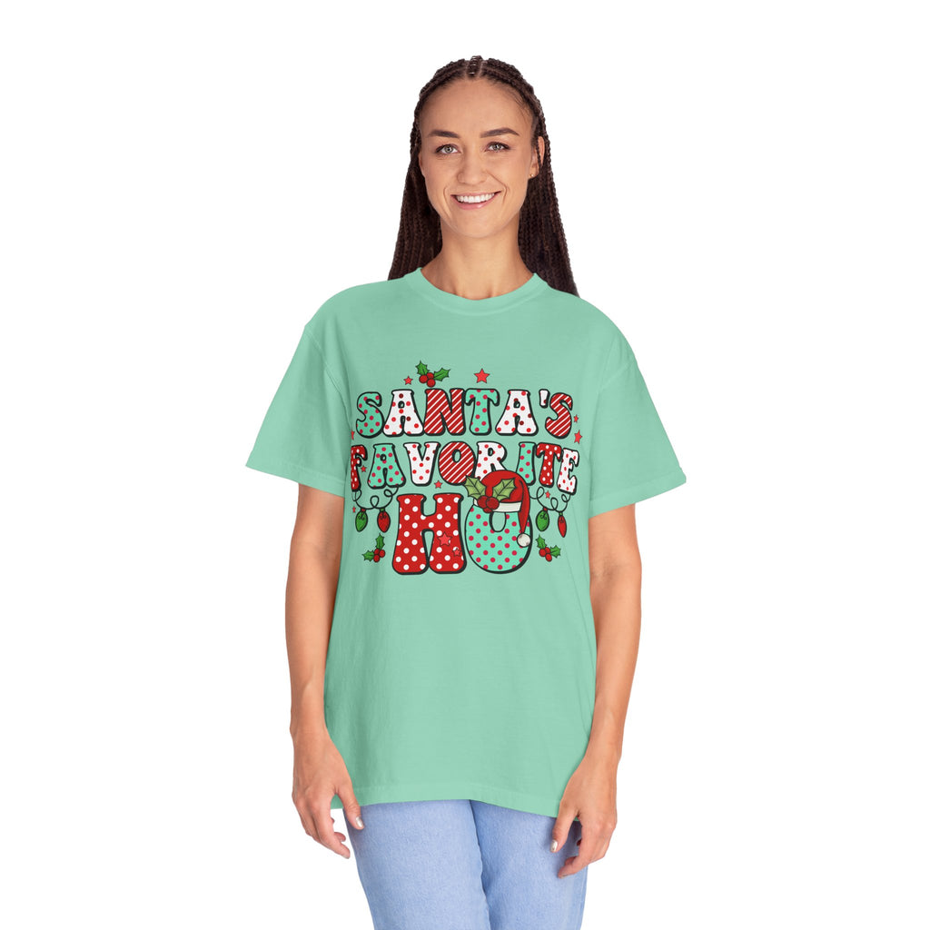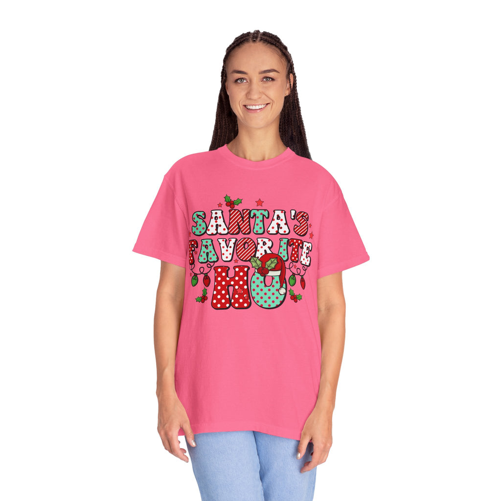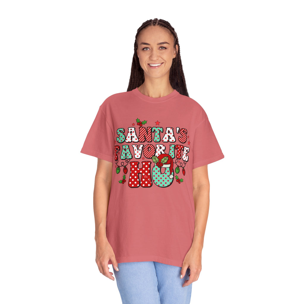 This soft, garment-dyed tee brings a playful, vintage holiday vibe to everyday wear. The relaxed fit and medium-weight 100% ring-spun cotton drape comfortably while the post-construction dye gives each shirt a lived-in color and texture that deepens with time. The cheerful, hand-drawn lettering and ornament accents read “Santa’s Favorite Ho” — a cheeky, tongue-in-cheek design that sparks laughs at family parties, tree-lighting nights, and casual holiday hangouts. Durable double-needle stitching and a tubular, seam-free body keep the silhouette clean and sturdy through many seasons. Offered in a wide range of colors and sizes, this tee slides easily under a cardigan or pairs with jeans for laid-back festive looks.