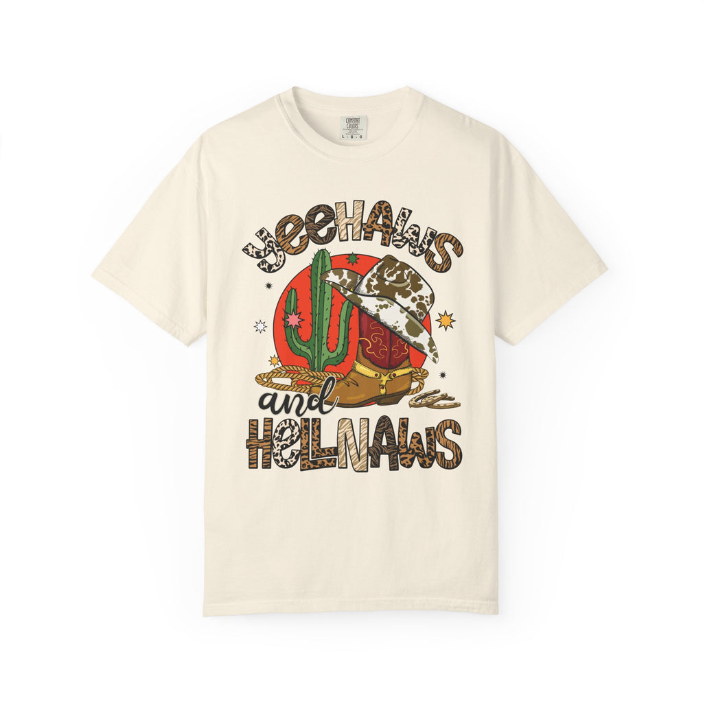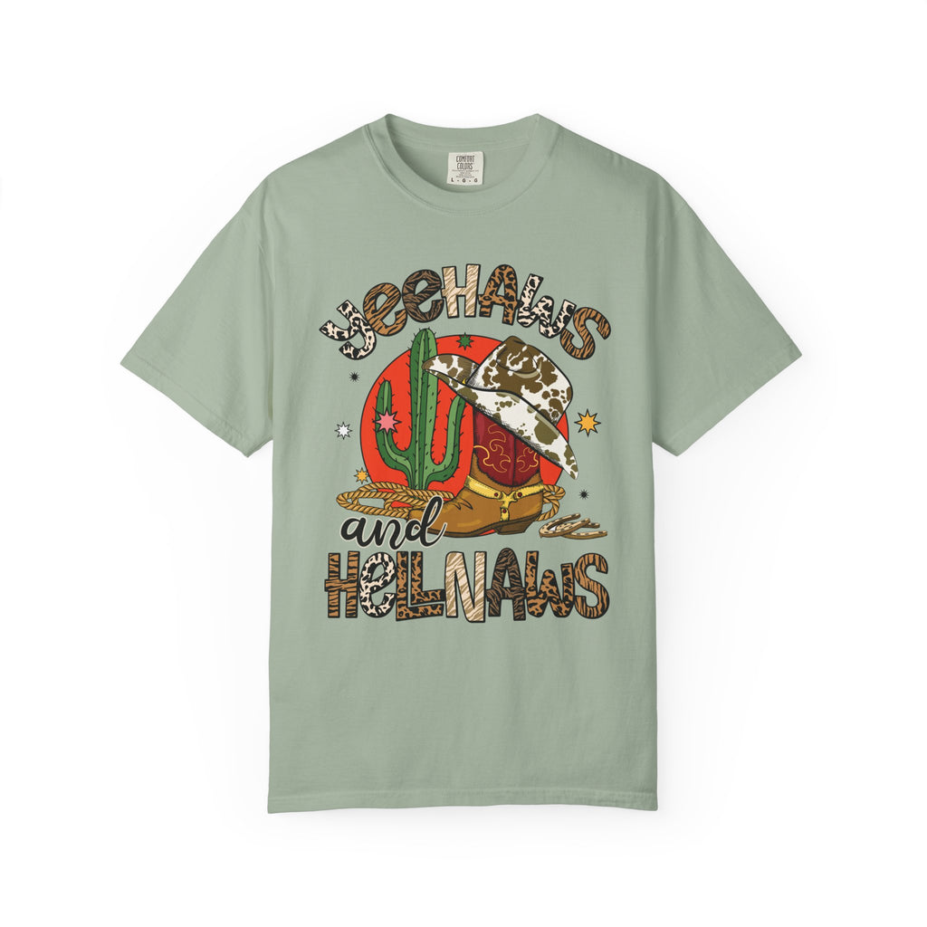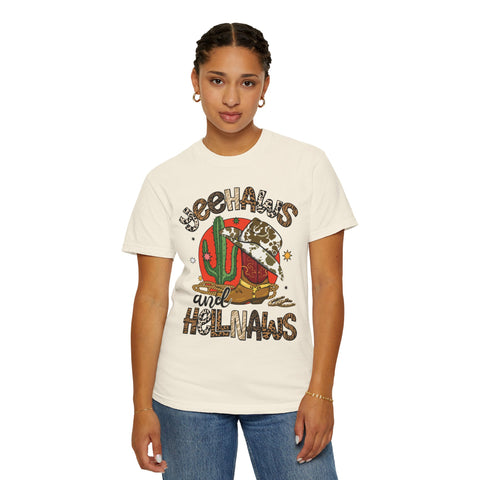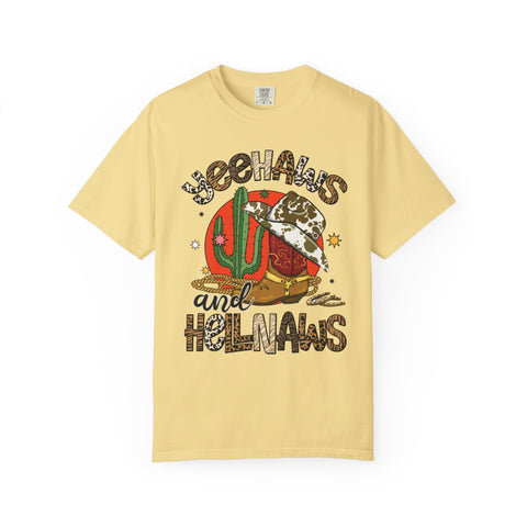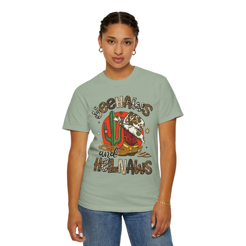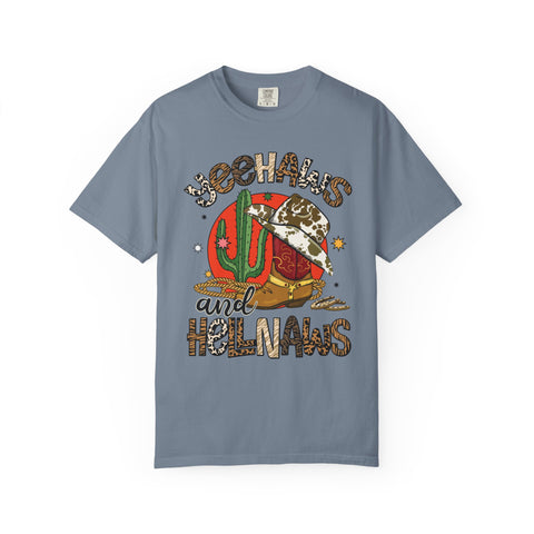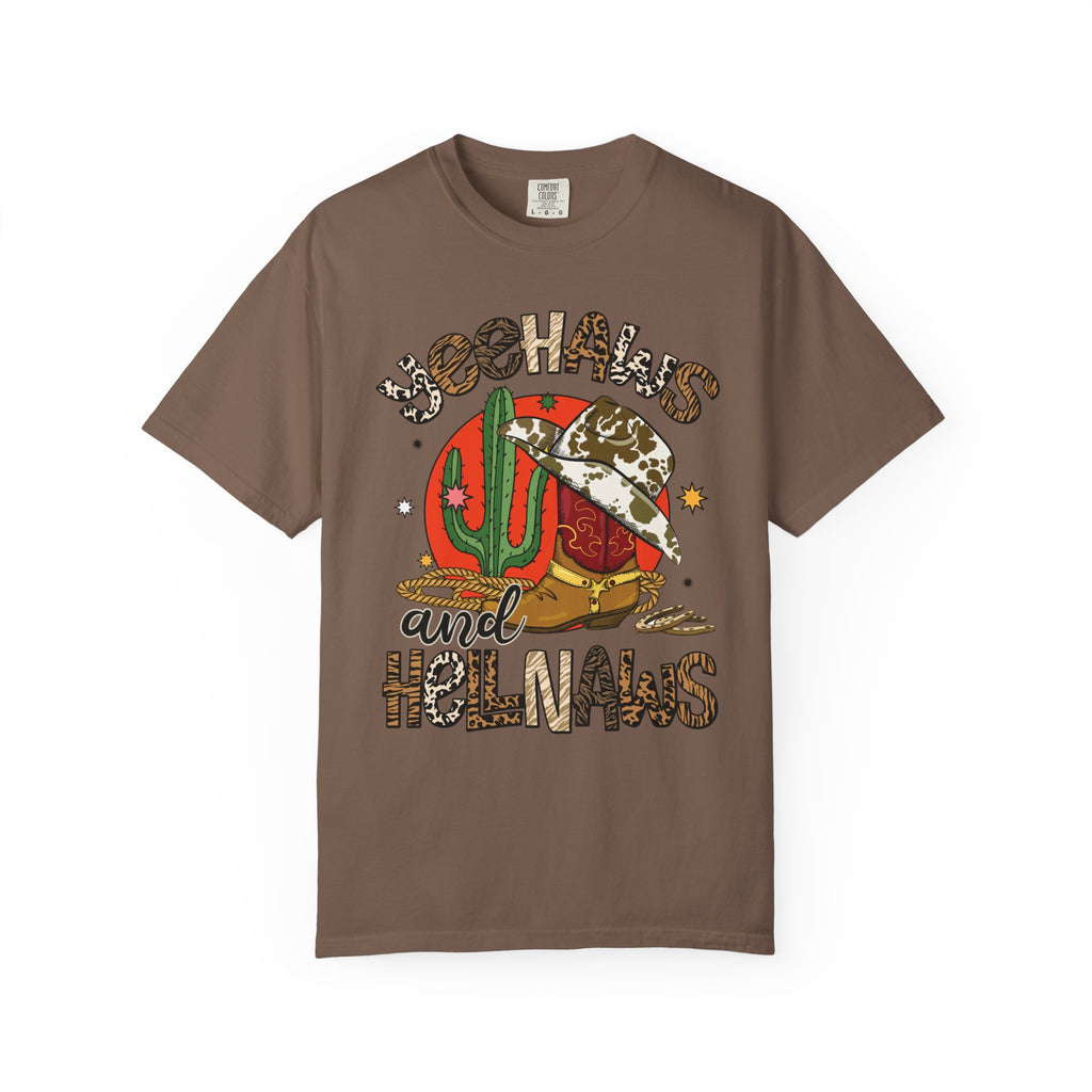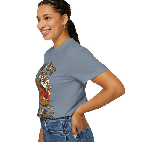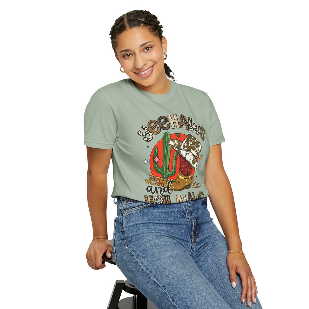 This relaxed, garment-dyed tee brings sunbaked desert charm to everyday wear. The soft, lived-in fabric and warm, muted color let a bold, retro desert graphic take center stage — think cactus, cowboy hat, and playful lettering that reads as part-sass, part-sunset. Wear it on slow drives down dusty roads, at weekend market runs, or layered under a denim jacket for nights around a backyard fire. The heavier midweight cotton holds shape while the garment-dye gives each shirt a unique, slightly faded finish that feels broken-in from day one. It’s a comfortable, casual staple for people who love southwestern vibes and vintage-inspired style.